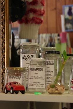 This week has been about organizing my stuff. I decided to get clear glass jars and put labels on them. I looked on the internet for inspiration and found some interesting ideas. The one I used puts what I love onto the jars. I love words/writing. I have hair clip and t shirts with writing pattern on. I started making jar labels with the word on it eg charity then I wrote the definition of it under the word. The hardest part is getting the right jars. I looked in my moms glass recycling and found a few and then resorted to looking in the recycling at the pavillion. Still need a lot more.