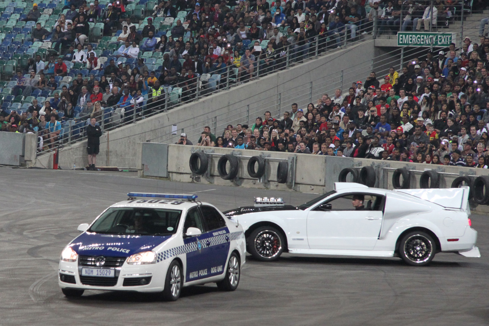 After seeing all the exhibitions we went to go watch some stunt driving. They were driving through traffic cones. The thing I found scary was that they were driving so fast and the guy sweeping the dirt of the tar was just standing there, cars driving around him. They gave people the opportunity for R100 each to go in the stunt car while he drove around the cones.
