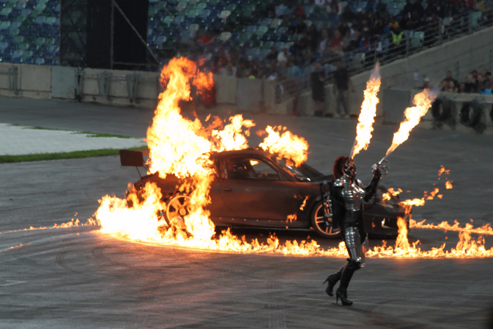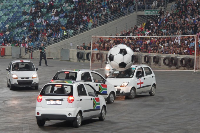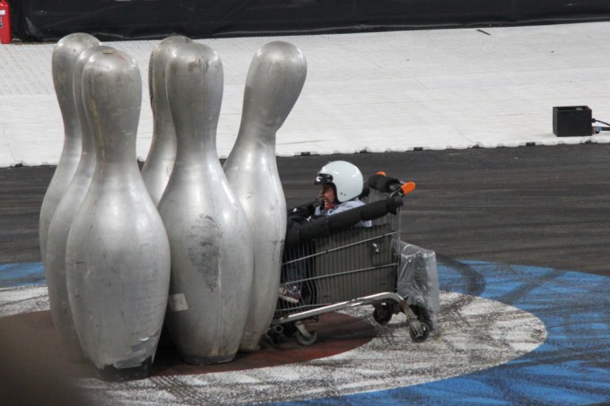 It was then about time for the show. They show was so hilarious. They made it into the car Olympics. They had curling with cars and a sweeper, bowling with a shopping trolley, chariot race with the Stig, cars on fire and car soccer. I think my photos will tell it all better than I can. South Africa won the soccer against England. They had a street drag race for a few min then a cop car came to brake up the party.